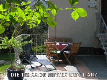 - eine Terrasse hinter dem Haus mit Morgen- und Abendsonne und einem schattigen Platz in der Mittagshitze im Sommer
